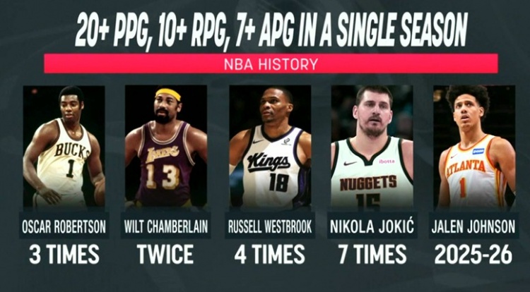 B体育极速体验-赛季场均20+10+7榜:约基奇7次威少4次 大O3次大帅2次 杰伦约有望